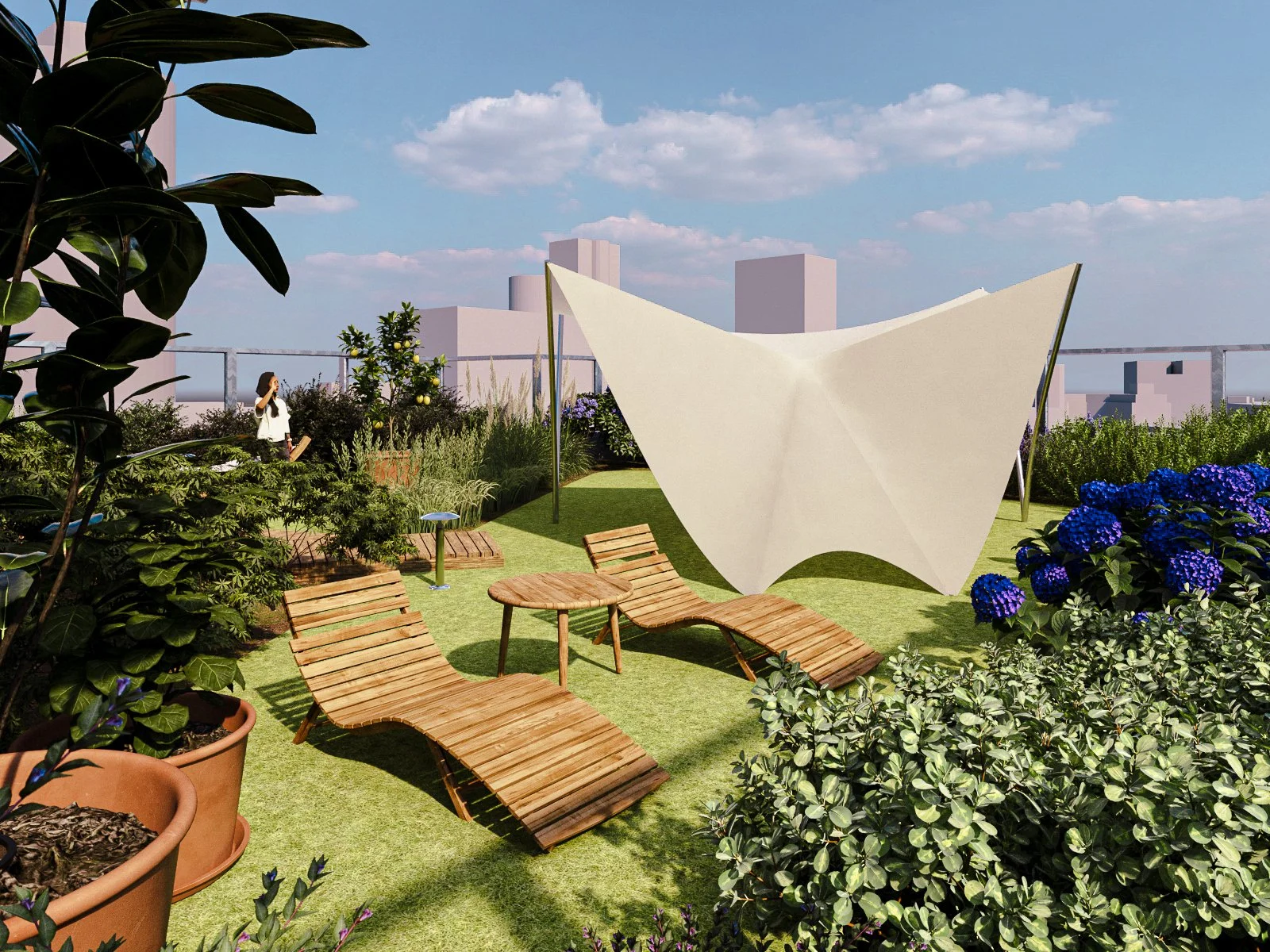 The canvas material not only keeps the structure lightweight but also helps create a soft, diffused light that makes the space feel more inviting. This gentle lighting creates a relaxed atmosphere, good for both socializing and personal reflection. The roof’s design also enhances the connection to nature, which is a central theme in the overall rooftop concept. The roof gives a sense of openness to the outdoors, allowing residents to enjoy the fresh air and natural light when desired.